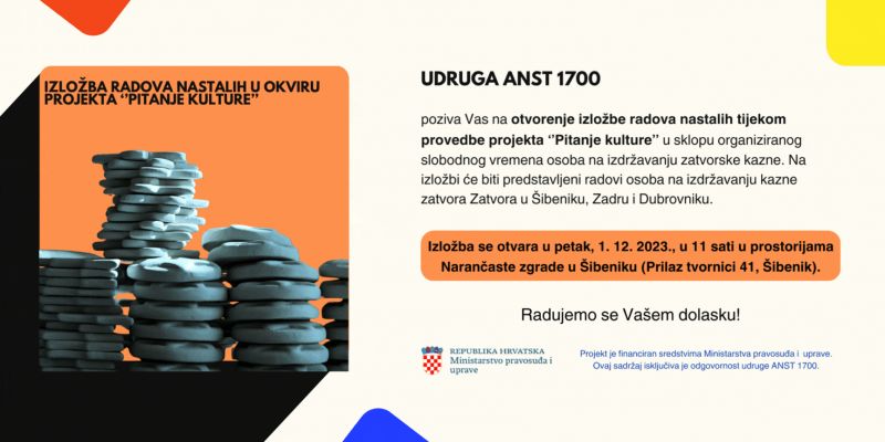 O okviru Mjeseca borbe protiv ovisnosti, sutra u 11 sati, u NARAnčastoj kući u Šibeniku otvara se izložba radova nastalih u okviru projekta ''Pitanje kulture'' koji tijekom 2023. i 2024. godine provodi splitska udruga ANST 1700, a s ciljem podizanja kvaliteta življenja i kvalitete provođenja slobodnog vremena kroz radno-okupacijske aktivnosti za osobe koje se nalaze na izdržavanju zatvorske kazne u zatvorima u Šibeniku, Splitu I Dubrovniku.