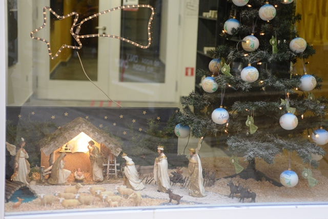 Klasično, s jaslicama i borićem ukrašen je izlog Civitas Sacra centra.