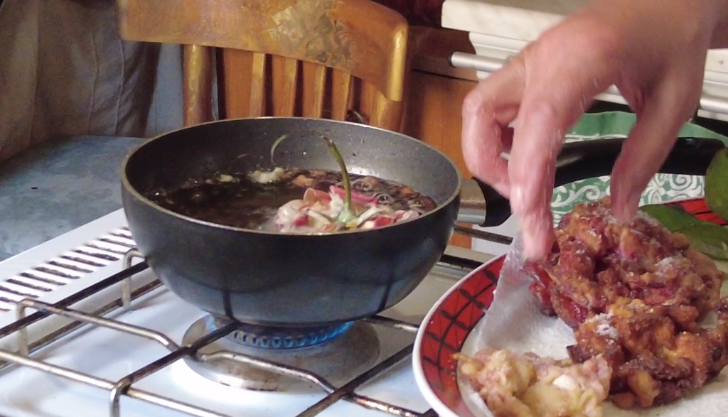Vako možeš pržit cvit tikve il jabuke na fete. Dobro je i to, al oni oto ne okvasu u maraštinu oliti prošek sat prije. Cvit o tikve solu, a fete jabuke najprvo malo kuvaju u puno slatkoj vodi.”
