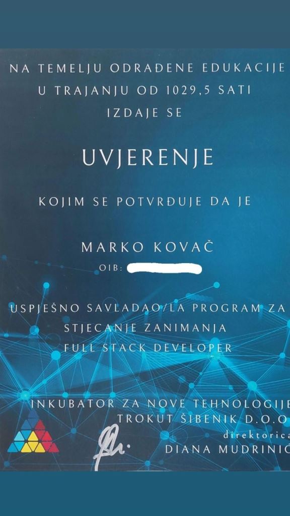 „Završio sam srednju školu u Šibeniku, računalni tehničar za strojarstvo. Upisao sam faks u Splitu i došao skoro do kraja, a onda sam shvatio da to nije za mene i ispisao sam se, a preostao mi je samo jedan semestar. Otkad znam za sebe bio zainteresiran za kompjutere, za tehnologiju. Nakon što sam napustio faks vidio sam oglas za NEET akademiju, prošla mi je prijava, krenuo sam i u tome sam se pronašao. Tečaj je trajao 6 mjeseci, ali to nisu bila samo predavanja, nego sam cijeli bio u tome. Bilo je to danonoćno učenje, a i dan danas je tako. U ovoj struci stalno moraš učiti jer se tehnologije mijenjaju iz mjeseca u mjesec. Akademija mi je bilo više nego dobra podloga. Stekao sam neka poznanstva koja su mi pomogla u prvom redu ekipa Trokuta na čelu s Ivanom Šodom. Oni su mi bili najvažniji za povezivanje s potencijalnim poslodavcima”, otkrio nam je Marko dodajući da mu je jako važno to što može raditi i živjeti u svom rodnom gradu.