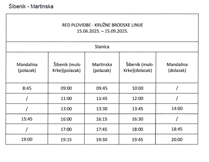 Brodovi koji će i ove godine prevoziti kupače na Jadriju i Martinsku kreću od sutra, 15. lipnja. Za Martinsku na relaciji Mandalina – Šibenik i natrag vozi brod Avalon, kao i proteklih godina, a na Jadriju Zelena laguna.