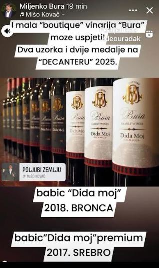 Vina dr. Miljenka Bure, vlasnika boutique vinarije Bura, babić ‘Dida moj’, iz 2018. godine dobilo je brončanu, a babić ‘Dida moj’ premium, iz 2017. godine srebro na ovogodišnjem 22. Decanteru (DWWA), najvećem i najutjecajnijem vinskom natjecanju na svijetu koje je održano u Londonu.