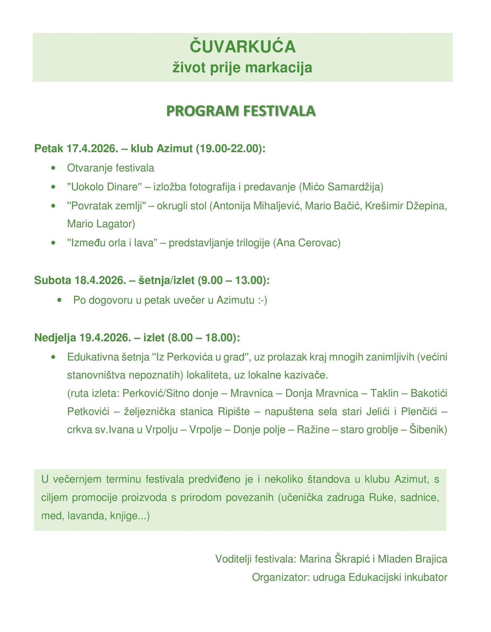 U organizaciji udruge Edukacijski inkubator od 17. do 19. travnja u Šibeniku će se održati drugo izdanje festivala ‘Čuvarkuća – život prije markacija’, manifestacije koja kroz predavanja, šetnje i izlete promiče povratak prirodi, tradicijskim znanjima i aktivnom boravku na otvorenom.