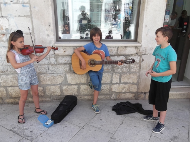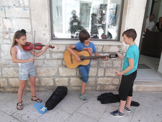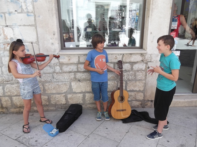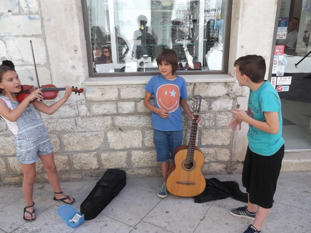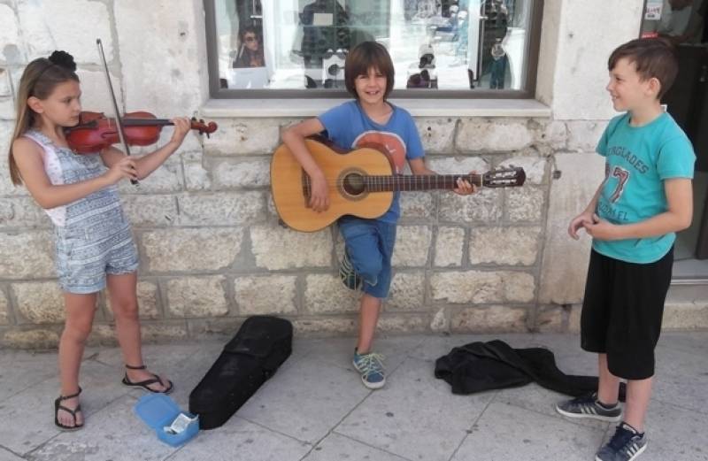 Tonka Avdagić, Jona Medić i Mario Šiprag, šibenski osmoškolci sigurno su najmlađi ulični svirači i pjevači u Šibeniku, a i šire. Tonka na violini i Jona na gitari danas su na trgiću s kojeg se račvaju Kalelarga i Masna ulica zabavljali svojom svirkom prolaznike, a oni su im u "škrabicu" ubacivali novac. Treći član ekipe Mario povremenoje uskako s pjesmom, a neke stihove je smislio sam.