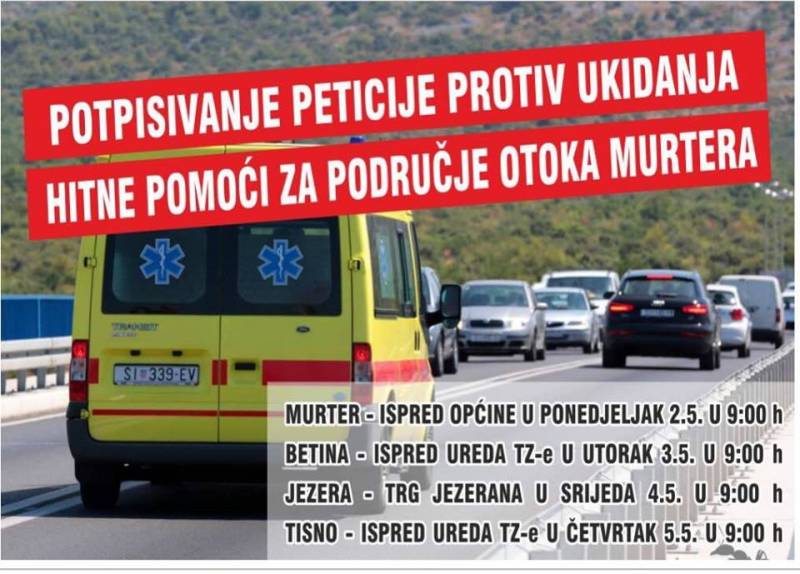 Od 2. do 5. svibnja na području Općine Tisno bit će organizirano potpisivanje peticije protiv ukidanja timova T-1 ispostave Zavoda za hitnu medicinu Tisno koje se planira preseliti u Vodice.