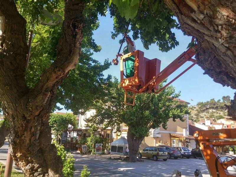 Riječ je o tzv. aleji murava te djelatnici skradinskog komunalnog poduzeća šišaju one grane stabala koje zaklanjaju javnu rasvjetu i na taj način utječu na sigurnost svih sudionika u prometu.